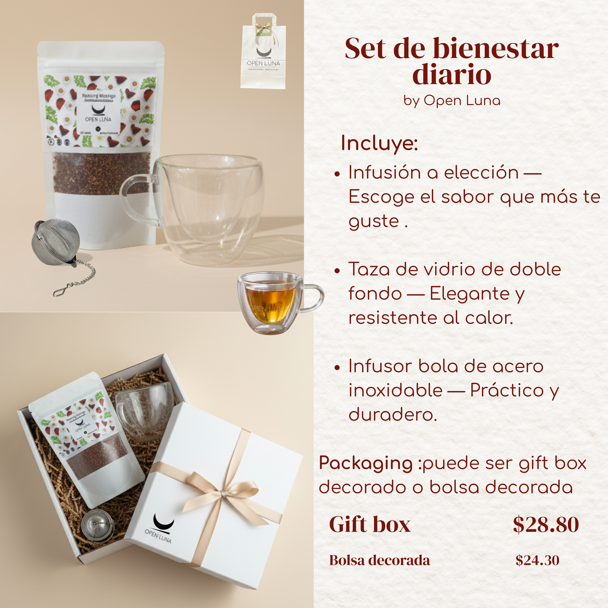 • 🍃 Infusión a elección — Escoge el sabor que más te agrade de nuestra línea Open Luna.